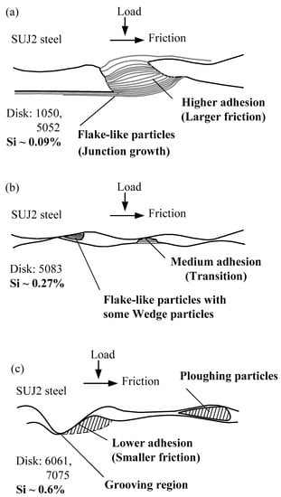 By considering all of the above experimental results as well as the previous studies by the authors [29,30,31], three frictional models and wear mechanisms that describe the effects of the content of doping elements on the friction and wear of SUJ2 steel sliding against aluminum alloys are proposed. It is observed from Figure 11a that the flake-like particles resulted from the higher adhesion at the junction growth region for the low content of silicon (only 0.09%): 1050 and 5052 aluminum alloys. Hence, more friction is caused. Figure 11b shows that medium adhesion is present at the interfaces for the medium content of silicon (0.27%): 5083 aluminum alloy. The flake-like particles with some wedge particles were developed from both the junction growth and the adhesive transfer of the wedge. Figure 11c shows that the relatively large ploughing particles were caused by the grooving wear mechanism for the high content of silicon (~0.6%): 6061 and 7075 aluminum alloys. Hence, less friction is caused due to the lower adhesion. These results correspond to the previous friction coefficient responses. Wear mechanisms change as the silicon content increases, from the junction growth to the wedge particles, and even to the ploughing particles.