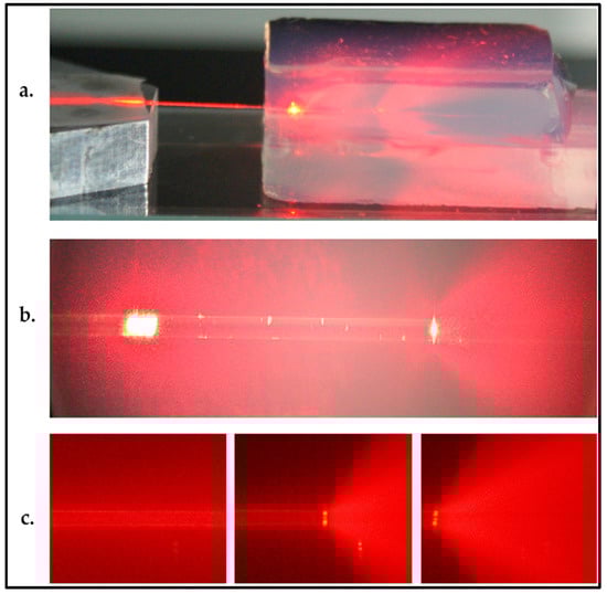 Xiao et al. [25] characterized the wave-guiding properties of water-filled channels created within aerogel monoliths, 125 μm in diameter, by coupling light into the channel via an optical fiber and measuring optical attenuation in the channel (see Figure 5d for illustration). A laser light with a wavelength of 635 nm was coupled into the other end of the fiber used in the characterization. Figure 11a,b show water-filled channels with light coupled into them. In both cases, diverging light beams emerge from the right end of the water-filled channel. Due to evaporation through the aerogel pores and the open channel end, the water inside the channel receded from right to left in a short span of time, resulting in the channel partially filled with air (Figure 11c). After emerging from the water-filled part of the channel, light could no longer be guided and its propagation was observed as a diverging cone of light due to light scattering from the aerogel particles (Figure 11b,c).