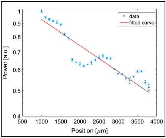 The total transmitted power integrated over the cross section of the channel was then plotted as a function of the propagation distance along the waveguide, as shown in Figure 17. The output power of the waveguide exhibited regular oscillations superimposed on an exponentially decreasing background. As argued above, these oscillations resulted from the path-dependent interference of multiple guided modes. The measured power of the transmitted light was fitted with an exponential curve as P(z) = Poexp(−αz) where z is the propagation distance along the waveguide axis and α is the attenuation coefficient. From the particular measurement shown in Figure 17, α was obtained as 2.278 cm−1. The propagation loss of the optical waveguide (η) was then calculated as −9.9 dB/cm using the equation η = −10α/ln10. This propagation loss is around 7 times higher than −1.5 dB/cm propagation loss obtained in the previous demonstration by Xiao et al. [25]. This difference is mainly due to increased roughness of the channel surfaces produced by laser micromachining, leading to higher scattering losses in the waveguides.