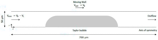 Every simulation was done in a frame of reference moving with the bubble (MRF), i.e., imposing to the wall the velocity of the bubble. Since the liquid is flowing in co-current, a fully developed laminar velocity profile was imposed through a user-defined function at the inlet of the domain. At the outlet, a pressure outlet boundary condition was assumed. The velocity and pressure initial conditions were set to zero. As the simulation progressed, the velocity of the wall was iterated until the bubble nose remained stationary. As a result, the velocity of the bubble is one of the outputs of the simulation. A schematic representation of the simulated domain is present in Figure 1.