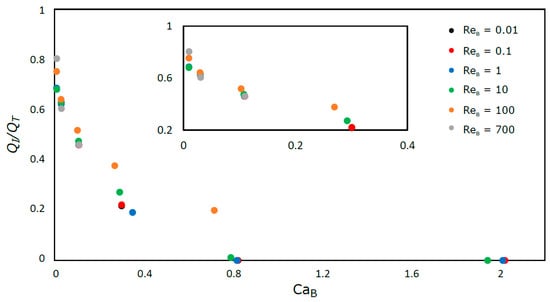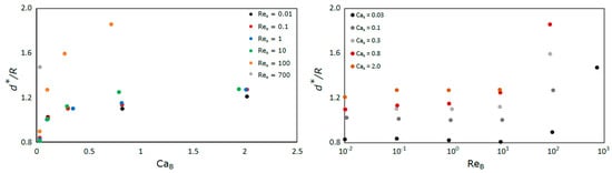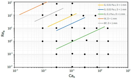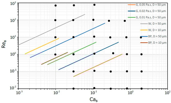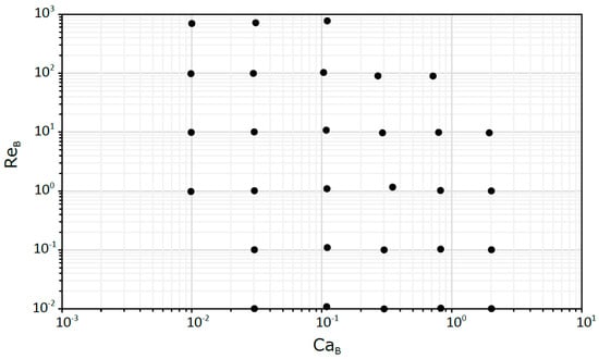 The different dimensionless numbers were generated by varying the input parameters of the numerical simulations. Regarding the properties of the fluids, the density and surface tension values were maintained for all studied cases, and only the viscosity of the liquid was changed, i.e., the common property of the dimensionless numbers. The different conditions analyzed are presented in a ReB versus CaB plot in Figure 2.