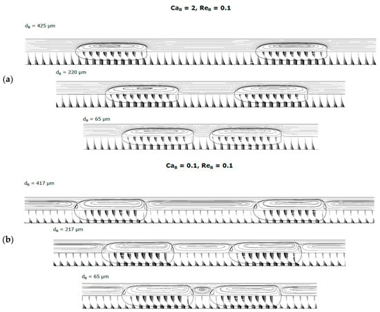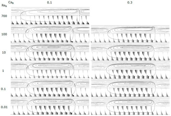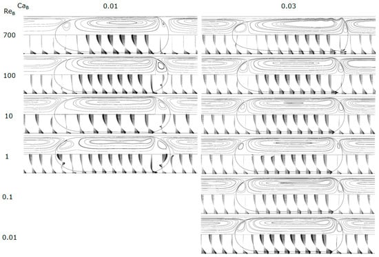 For values of CaB < 0.3, the streamlines (MRF) in the liquid slug show semi-infinite recirculations, occupying a larger part of the cross-section of the channel. The extent of the cross-section occupied increases as CaB decreases. The mean velocity of the fluid moving inside the external envelope of these streamlines is equal to the bubble velocity. The fluid placed ahead the bubble, between the external envelope and the tube wall, moves at a lower velocity than the bubble and will be surpassed by the bubble. As CaB decreases, the thickness of the film also decreases, and according to the stagnant film hypothesis (Equation (14)) the bubble velocity also decreases. The center of the recirculation vortex moves away from the center of the channel into the wall direction. Previous studies found in literature report similar recirculations in MRF [27], with many of them focused on the flow pattern in liquid slugs between two bubbles [26,28,33]. This topic will be developed later in the text. For CaB = 0.8, there are no recirculations and the bubble is moving faster or at the velocity of the liquid in the center of the tube; this flow pattern is often called bypass flow.