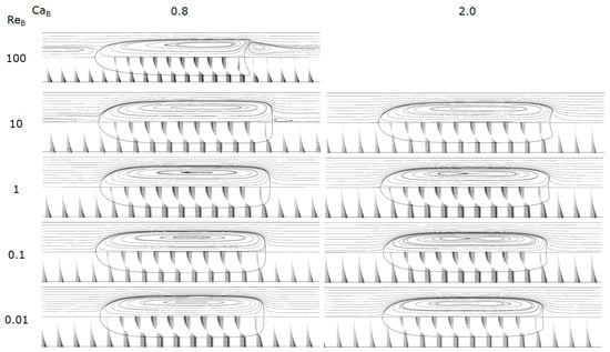 Figure 5, Figure 6 and Figure 7 show the shape of the bubble, together with the streamlines and the velocity vectors in a MRF. An increase in CaB causes the front of the bubble to become slenderer for the whole range of ReB studied. The rear of the bubble tends to become more concave for higher CaB, being this effect more accentuated for high ReB. Additionally, for high ReB, appear some stationary wavy patterns near the back of the bubble. Figure 8 shows the contours of the bubble for each ReB studied.