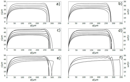 Contours of the bubble: (a) ReB = 0.01; (b) ReB = 0.1; (c) ReB = 1; (d) ReB = 10; (e) ReB = 100; and (f) ReB = 700. Thinner bubbles correspond to higher Ca.