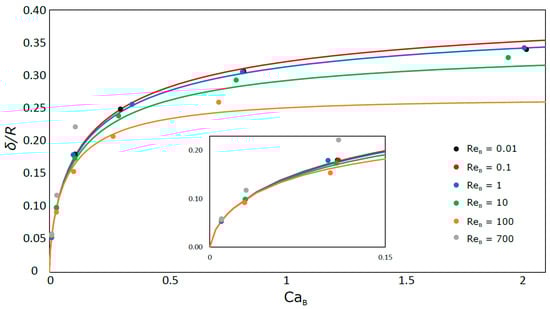 Liquid film thickness as a function of CaB. The solid lines represent the correlation of Han and Shikazono [17].