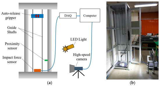 Drop tester configuration: (a) schematic diagram; and (b) experimental setup.