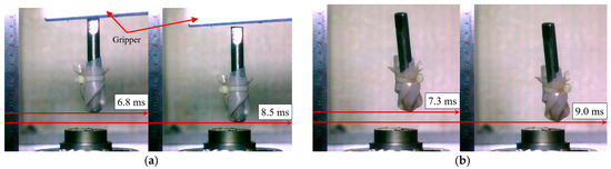 For the comparison of the falling velocity just before the impact, the traveling time for a distance of 10 mm was measured with a high-speed camera, as shown in Figure 4. The traveling time was estimated as 1.7 ms for both tests. Therefore, we can conclude that the falling velocity is 5.88 m/s and this velocity can be used as the initial velocity for finite element analysis.