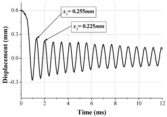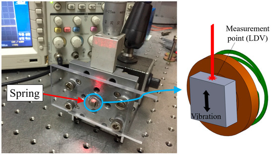 Figure 5 shows the experimental setup for measuring the vibrational behavior of the spring with a moving mass and the data was obtained by laser Doppler velocimetry (LDV). The direction of the vibration and excitation was matched with the falling direction of the dummy phone. Since the moving mass of the LRA is very small and the reflection characteristic is low, it is difficult to measure with laser. Then, the hexahedral magnet was attached to the upper part of the moving mass, so that the laser measurement focus was positioned on the side. The measurement was run on a vibration isolation stage (vibration isolation system, DAEIL SYSTEMS) to mitigate any vibrational noise and the data was acquired by an oscilloscope (Tektronix, Beaverton, OR, USA). As shown in Figure 6, the magnitude of the first peak was 0.255 and the second one was 0.225; therefore, the damping ratio () of the spring was eventually calculated as 0.02 using the logarithmic decrement method.
