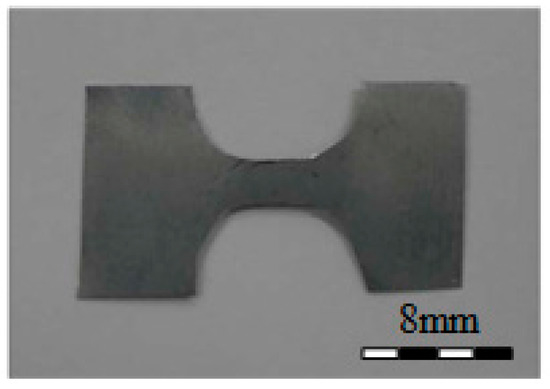 The LRA spring in this study is a thin plate 100 μm thick and 9 mm in diameter. The mechanical property of the thin plate is quite different from a bulk material because this can be changed by the correlation of the grain size with the component size [15]. Therefore, the micro-tensile test with a specially-prepared specimen was conducted to understand the mechanical property of the spring. The material of the specimen was SUS301 and this specimen was prepared with 200 μm thick, 3 mm gage length, and 19 mm total length using photo etching as shown in Figure 7. A universal material testing machine (UT-005, MTDI, Dajeon, Korea) was used in the micro-tensile test and the stress–strain curve of the SUS301 is shown in Figure 8. Even though the ultimate tensile strength (UTS) of SUS301 is known to be 1300 MPa [16], the UTS in this micro-tensile test was measured as 1510 MPa because of the size effect.
