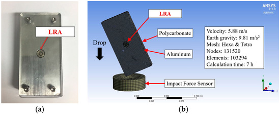 Physical and FE model of dummy phone with LRA: (a) dummy phone as a test specimen; and (b) finite element analysis.