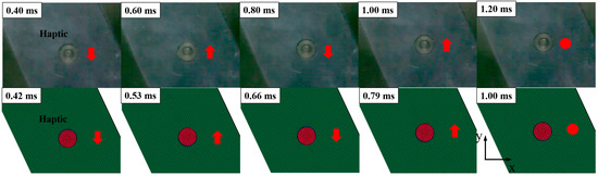 We can identify the rebounding behavior of the moving mass from the high-speed camera and FE simulations, as shown in Figure 10. The movement was basically a relative motion of the dummy phone. The motion was measured by analyzing the high-speed image with the post-processing software Image J. A dot tracking method was applied to the center of the moving mass in the test. After numerical computation, tracking data was compared with the displacement of the center mesh from the finite element analysis (FEA) results. The moving mass was oscillated with 0.40 ms period in the drop test whereas the oscillating period was 0.24 ms in the FE simulation. Despite this discrepancy of the oscillating period, we can insist that the FE model was valid for this application because the moving mass in both cases was stabilized after two periods and the rate dependency of the metallic structure can be negligible.
