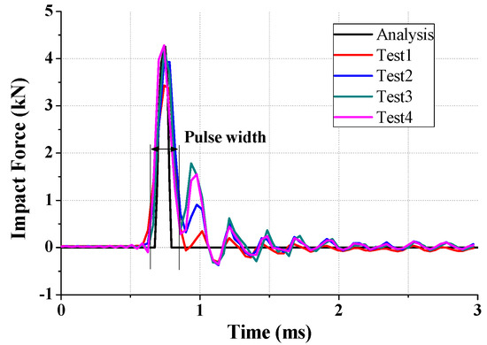 In spite of the short period of time, the estimation of the accuracy of the impact force is very important because it can cause external and internal damage to the structure. Therefore, the agreement of the impact force from the drop test and the FE simulation must be checked. The peak force from the drop test and the FE simulation was measured and verified the validity of the analytical model as shown in Figure 12 and Table 2. The four tests were conducted and the average peak force was measured as 3959.78 N with a 329.64 standard deviation. This value corresponds to the FE simulation results. On the other hand, it has the small error (7.5%) from drag and friction forces.