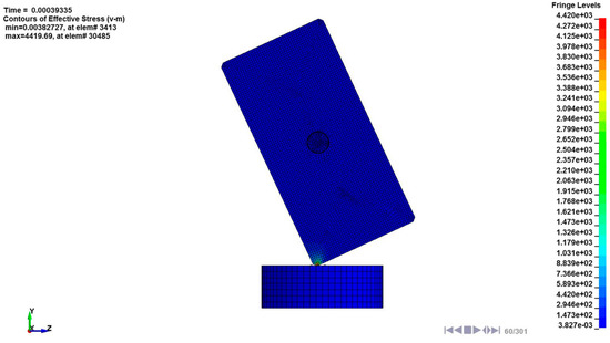When a smart device, such as smartphone, drops on the floor, it starts the rotation due to rotational momentum generated by its asymmetric mass distribution. This rotation can increase the uncertainty and make appropriate analysis difficult. Therefore, the rotational motion of the dummy phone used in this study was restrained to avoid this uncertainty and to obtain the appropriate simulation results during the FE simulation. In the FE modeling, the vertical line on the ground was considered as the datum line, and the mass distribution of the dummy phone, which was the impacted object, was bilaterally symmetrized with respect to this datum line. At the rebounding state, we can achieve the translational motion of the impacted object without any rotational motion using this FE model. The stress contour from the FE simulation is shown in Figure 13. The impact occurred at 0.33 ms and maximum stress was observed as 4420 MPa at 0.39 ms. The stress was concentrated in the vicinity of the impact point and this concentration phenomenon was verified as observing the damage in the experiment. At 0.46 ms, the impacted object began rebounding and the LRA, including the moving mass and spring components, started the oscillation. The traveling behavior of the LRA spring attached to the impacted object is already shown in Figure 11b.