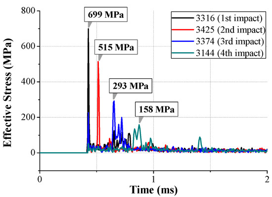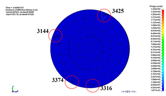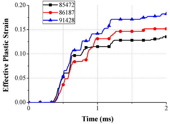 Figure 17 illustrates the effective plastic strain for certain elements subjected to concentrated stress. The plastic deformation began at 0.35 ms as the impact was transmitted to the spring. The initial strain slope of each element was similar, but the strain was increased due to the high stress condition after the first period (0.63 ms). Even the strain of element 86,187 overtook the strain of element 85,472 at 1.0 ms because the accumulation and dissipation of the impact energy was different for each element during the transient state. The maximum strain was calculated as 0.135, 0.182, and 0.152 at element 85,472, 91,428, and 86,187, respectively.