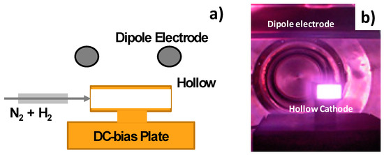 High-density plasma nitriding has been used for hardening metals and alloys such as stainless steels, tool steels, and titanium and aluminum alloys with the use of DC-biased metallic tubes (referred to here as hollow-cathode devices) [3,4,5,6]. In these processes, these metallic alloy parts and components are efficiently plasma-nitrided in hollow-cathode devices. For example, AISI-420 martensitic stainless steel die-parts have been plasma-nitrided at 673 K for 14.4 ks to have a hardness higher than 1000 HV [3,7,8]. In addition, AISI304 and AISI316 stainless steel plates were also plasma-nitrided at 673 K for 14.4 ks by 70 Pa to have a nitrided layer thickness higher than 80 µm and a hardness higher than 1400 HV, respectively [9,10,11].