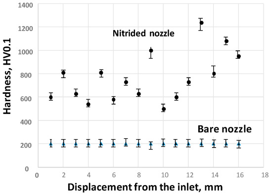 On the other hand, the hardness, measured at the inner surface area of the nozzle outlet, reached 600–800 HV. This proves that the inner surface of the through-hole in the mini-nozzle is nitrided and hardened at a significant depth.
