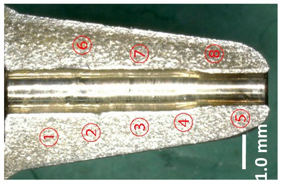 The mini-nozzle in Table 1 is widely utilized as a guide structure to control the movement of the fibers. The hardening of its inner surface is essential to prolong its lifetime. This mini-nozzle has a through-hole, the inner diameter of which decreases to 1.3 mm at the outlet. After plasma nitriding at 693 K for 14.4 ks, the nitrided mini-nozzle was wire-cut in half via electric discharge machining. The micro-Vickers testing was performed with a diamond indenter. Figure 6 depicts the optical microscope image with the hardness measurement locations from #1 to #8 along the nozzle outlet.