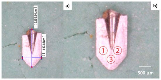 In the nitriding process, the specially designed jig was prepared to fix this micro-nozzle so that the mixed gas flow direction coincides with the center line of the through-hole of the micro-nozzle. In a manner similar to the post-treatment of the mini-nozzle, the specimen for analysis was prepared from the plasma-nitrided micro-nozzle. Figure 8 depicts the optical microscopic image of the specimen with hardness measurement locations from #1 to #3 at the vicinity of the nozzle outlet inner surface. The positions of #1 and #2 are located at the vicinity of the inner surface of the through-hole, while #3 is selected to locate only on the inner surface of the through-hole.