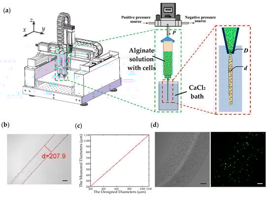 This equation can then be used in the diameter control of the hydrogel fibers. If we want to fabricate a hydrogel fiber with a designed diameter, we firstly select the nozzle according the comparison between the designed diameter and offset coefficient c. Subsequently, the driving pressure can be calculated via Equation (2) with the identified coefficients listed in Table 3. For example, if the designed diameter is 280 μm, the 0.25 mm nozzle will be chosen as the designed diameter is larger than the offset coefficient of the 0.25 mm nozzle (223.13 μm) and less than that of the 0.41 mm nozzle (402.82 μm). We assign 15 different diameters and the designed and measured diameters are recorded in Table 4. The errors between the measured and designed diameters are all within ±2.5%. In addition, if the measured diameter is plotted against the designed diameter, the experimental results in Table 4 can be graphically represented in Figure 1c. In this figure, the red line is the 45° line that represents a unitary mapping between the designed and measured diameters in the ideal case. The experimental results are plotted in blue dots. It is observed that the blue dots distribute very close to the 45° line, demonstrating that we can precisely control the diameter of the hydrogel fiber via Equation (2). This is helpful in the application of cell-laden hydrogel fibers in the 3D bio-fabrication of complex tissue structures.