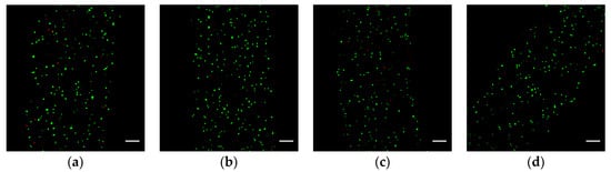 Fluorescence images showing the distribution of LIVE/DEAD cells in the hydrogel fibers after 24 h of culturing: (a–d) are the four samples soaked in the Ca2+ bath for 0, 5, 10, and 15 min, respectively. The green and red dots represent the live and dead cells, respectively; the scale bar is 100 μm.