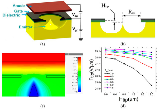 (a) Schematic and (b) Cross-sectional view of the self-aligned gated field emitter; (c) Simulation of the electric field distribution; (d) Simulation of the relationship between electric field at the emitter tip and height difference for different gate aperture radii.