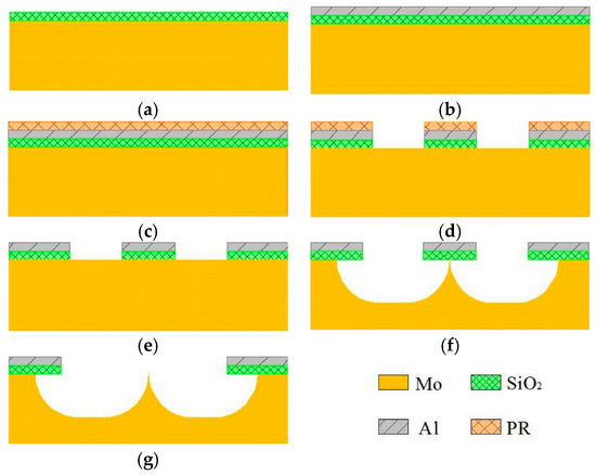 Fabrication process flow of the bulk Mo-FEAs (field emission arrays). (a) PECVD SiO2; (b) Deposition of Al layer; (c) Spin coating with PR; (d) Lithography and gate-stack etching; (e) Strip photoresist; (f) ICP etching of Mo emitter cone; (g) Ultra-sonication.