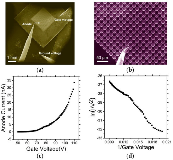 (a) Electron micrographs of the measurement configuration consisting of the anode, gate and ground landed electrodes, and (b) Magnified view. (c) Measured I–V characteristics of one gated Mo field emitter, and (d) the corresponding Fowler–Nordheim (F–N) plots.