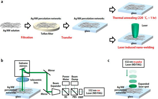 Figure 1a shows the preparation of an Ag NW-based conductor sample. In order to prepare a film of Ag NW percolation networks on the substrate, Ag NWs are deposited according to the following procedures. Firstly, Ag NWs are synthesized in a solution via the polyol synthesis method [32]. Afterwards, synthesized Ag NWs are filtered out onto the Teflon filter and transferred onto the glass substrate successively. The diameter of the transferred Ag NW percolation networks is ~36 mm due to the size of the Teflon filter. Since transferred Ag NW percolation networks on the glass substrate are weakly bound, the post thermal annealing process, such as a hot plate and furnace, is required to increase the electrical conductivity of the Ag NW percolation networks. Additionally, the LINW process is conducted to the Ag NW percolation networks as an alternative post annealing process for comparison.