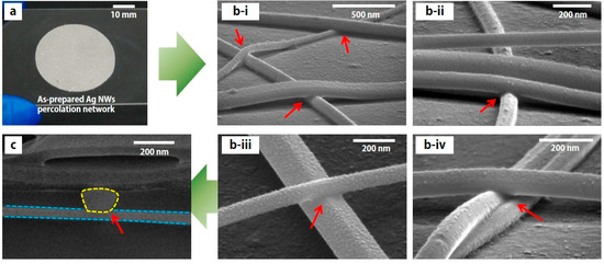 In order to verify the melting at the junction of Ag NWs, a cross-sectional SEM image at the boundary which is cut by a focused-ion beam (FIB), is examined. It is confirmed that the crossed area of two Ag NWs (yellow and blue dotted lines) are melted and fused at the junction, as shown in Figure 2c. The results for the flexible transparent conductor and stretchable conductor are very noticeable, since melted and merged Ag NW percolation networks will have better electrical/mechanical properties such as electrical conductivity, mechanical elongation, and mechanical strength [13,15,18,19].