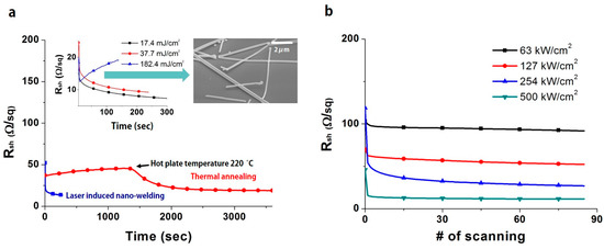 Figure 3 shows sheet resistance changes at various times under the thermal annealing process and ns pulse LINW process. The transmittance of prepared Ag NW percolation networks in (a) and (b) are 95% and 96%, respectively. As shown in Figure 3a, the sheet resistance of Ag NW percolation networks is gradually increased and gently dropped below 20 Ω/sq with long processing time (over 1 h) under the thermal annealing process. At first, the sheet resistance is gradually increased due to oxidation formation and the resistance increase of Ag NWs to temperature change, according to their temperature coefficient of resistance [34,35]. Once the temperature of the hot plate reaches 220 °C (~1300 s), the sheet resistance starts to drop due to slight melting at the junction of Ag NW percolation networks. The thermal annealing process ensures stable low sheet resistance in Ag NW percolation networks and easily scales up the sample size. However, long processing time (over 1 h) is generally required to increase the electrical conductivity in the thermal annealing process, since a period of warm-up time for heating is required and only low temperature (below 250 °C) is available for the flexible substrate.