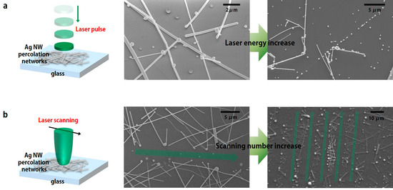 On the other hand, Ag NWs are selectively melted along the laser scanning direction in the cw scanning LINW process, as shown in Figure 4b (green arrows in SEM images). Since Ag NWs are ablated along the laser scanning direction, the remaining Ag NWs are locally connected to each other, thus this laser ablation technique is applied to fabricate patterned Ag NW mesh for flexible capacitive touch sensors [31].