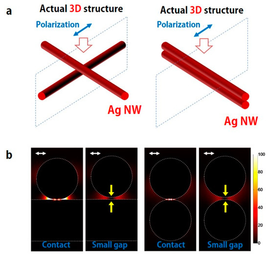 Finite difference time domain (FDTD) simulation at the junction of crossed Ag NWs. (a) Simulation layout of two crossed (left) and stacked (right) Ag NWs. (b) Electromagnetic field distribution at the junction with various conditions: crossed/contact, crossed/small gap, stacked/contact, stacked/small gap of two Ag NWs. The white arrow is the polarized direction of irradiated light. The yellow arrow indicates a small gap between two Ag NWs.