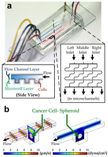 (a) A fabricated microfluidic chip for drug-screening assay. Three inlets are shown on the right-hand side with red, blue, and yellow dyes infused via a syringe pump. Five different colors appeared at culturing channels. Insets: side view of the microwell regions along a micro channel (left) and geometry of a differential mixer (right); (b) velocity (left) and shear stress (right) profiles along a microwell unit containing a cell-spheroid with a diameter of 100 µm. The red lines are streamlines.