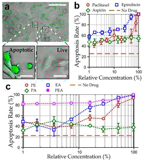 The efficacy of the therapeutic agents, paclitaxel, epirubicin, and aspirin [40] was first studied based on cultured cancer cells in conventional well-plates. We first counted the apoptotic MDA-MB-231 cells in the population after the treatment of one selected therapeutic agent with different concentrations (paclitaxel (P): 15 nM–1 µM, epirubicin (E): 50 nM–6.4 µM, or aspirin (A): 100 nM–32 µM) for 48 h. The cells were stained with green fluorescence signals on their cell bodies based on the caspase-3 activities (NucView 488 Caspase 3 Substrate, Biotium, Fremont, CA, USA) as described in Figure 2a. We estimated the apoptosis rate of cells in a culture well by quantifying the stained area relative to the entire cell population. Our results (Figure 2b and Figure S1) indicate that the cell viability reduced with the higher drug concentrations and longer treatment durations of paclitaxel or epirubicin, whereas aspirin cannot cause a majority of cell death in the culture even with a high concentration of 32 µM for 30 h.