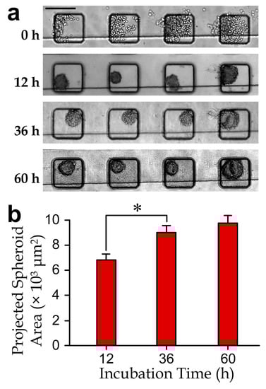 (a) Micrographs of the cell-spheroids in a microchannel section during a 60 h culture period. Scale bar: 200 µm; (b) projected area increment of cell-spheroids (N > 100 for each bar). The asterisk indicates a significant difference with the p-value < 0.05.