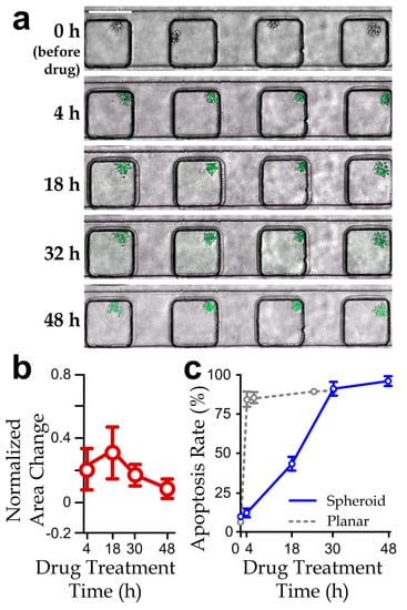We next implemented the drug tests using the microfluidic device to study the responses of cancer cell-spheroids. The spheroids (projected area: (6.9 ± 0.43) × 103 µm2) were first formed inside the device by culturing overnight, where individual cells were pretreated with the apoptosis-labeling fluorescence dye. We tested the PEA cocktail (167 nM paclitaxel, 1 μM epirubicin and 5 μM aspirin, which is 50% of the maximum concentration of PEA cocktail tested in Figure 2c) for 48 h. Notably, the culture duration of spheroids can affect cell viability, including insufficient nutrient supply in the inner spheroid bodies. For instance, Ivascu et al. [43] reported that viability of MDA-MB-231 spheroids can maintain with >95% within 3 days but drop significantly after 10 days. As we chose 48 h as the treatment period as also adopted by Patra et al. [29], any measured reduction in viability comparing to the control case should be mainly caused by the drug treatments. The result showed an insignificant change of the projected spheroid area, suggesting that cell proliferation could be effectively suppressed by the drug treatment (Figure 4b). In addition, we quantified the apoptosis rate of a cell-spheroid as the number of apoptotic cells related to the total cell number in the spheroid. A >85% apoptosis rate of the cell-spheroids was achieved after the treatment (Figure 4c). Remarkably, the drug response of the spheroids appeared to be slower than that of the planar cell layers, e.g., an ~80% apoptosis rate of planar cell layers can be obtained for only 4 h of the drug treatment (Figure S3 and Figure 4c, hidden line).
