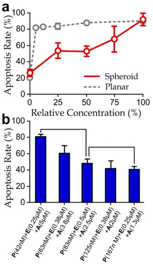 (a) Apoptosis rates of cancer cell-spheroids treated different relative concentrations of the drug cocktails (100% = P: 167 nM; E: 1 µM; A: 5 µM) for 48 h. (The results of planar culture extracted from Figure 2c are included here for comparison.) Asterisks indicate significant differences comparing to the planar cell layers; (b) apoptosis rates of the spheroids treated with different drug agent combinations for 48 h. N > 30.