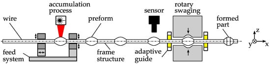 Handling constitutes a major challenge in the production of micro parts with regard to achieving an economic and efficient production. Due to the typically low price per unit, high outputs and consequently low cycle times are required. At the same time, precise positioning is necessary as the parts are very sensitive to mechanical damage and size effects []. For example, dominating adhesive forces may complicate handling. Van Brussel et al. [] provided a broad overview of the assembly of microsystems, in which handling is a main aspect. Adhesive forces are primarily derived from electrostatic attraction, Van der Waals forces, and surface tension. These forces depend on environmental conditions and can also be used for pick-up operations, but unfortunately complicate handling. Adhesion results in inaccurate grasping and negatively affects releasing. Grasping devices in general have been addressed in a previous study []. Tichem et al. [] gave a good overview of the micro-grip principles, while Fantoni et al. reviewed releasing strategies []. These challenges led to the development of new micro manufacturing and assembly concepts with adopted and integrated machine designs [,]. A complete micro bulk forming system was presented and analyzed by Arentoft et al. []. They considered not only the forming system itself but also all process steps, including handling. Subsequently, in another study [] examining this bulk forming system, a new handling system that maximizes the clock rate to up to 250 strokes per minute was presented and characterized. Furthermore, Fleischer et al. [] identified the supply of parts as a major bottleneck in micro assembly and presented a modular vibratory conveyor system, including options for separation, quality control, discard lock out and part orientation. A measure to facilitate handling and enable a production at higher output rates is the production in linked parts, which was introduced in a previous study []. This is especially important for micro forming processes and their special requirements [,], where multiple different operations may be performed on a single part. Applications of this approach to bulk forming based on sheet metal have been presented previously in the literature [,]. In contrast, the work presented in this paper addresses bulk forming based on wire material. Figure 1 shows an example of the production of wire-based linked micro parts. In the first process, preforms are generated within a wire by a laser material accumulation process []. The wire is melted partially while being pushed together. The remaining sections of the wire build the frame structure that links up the preforms. In a second step, the preforms are formed by micro rotary swaging [,].