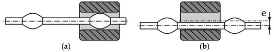 Depending on the processes and their spatial alignment, the guides along the process chain must meet different requirements. It is important that the guides suppress vibrations that occur between these processes. The part must be centered within the tools, close to the process. The vibrations induced by the process should be damped and the transmission of vibrations from the process to the linked parts outside the tool and vice versa must be suppressed. Furthermore, a compact size can be important due to space limitations. Conventional wire guides are typically realized as bushings consisting of ceramic materials. They are especially optimized for high wear resistance. As they are implemented as sliding guides, they usually feature a clearance. The clearance cannot be downscaled linearly to the micro range, which is related to tolerancing issues in micro production, as discussed in a previous study []. This problem already exists in the case of guiding raw wire material, because the diameter tolerances are too high. However, this becomes even more evident when considering the standard deviation of the preform diameters, which depend on the actual process parameters. Furthermore, with a constant bushing diameter, the clearance depends on the position of the parts, which can lead to a significant misalignment of the center line of the linked part (Figure 2). The linked parts used for the presented investigations feature a frame diameter of dframe = 360 µm and a part diameter of dpart = 660 µm. Hence, assuming that there is no clearance between the guide and parts, the maximum possible misalignment is er = 150 µm for this example.