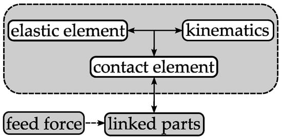 The general function of a linear guide is to limit the original six degrees of freedom of the guided part. In this present study, this means a translation in the feed direction and a rotation around the center line. By this definition, a wide solution space is spanned. Adaptive bearings can be either active or passive []. An active adaptive guide controls the clearance by measuring it with a sensor and adapting the diameter with an actuator comparable to the aforementioned grasping solutions. Regarding the needed components, such a system is comparatively complex. The complexity obviously becomes a major challenge when considering the huge number of adaptive guides that are required for the production of linked parts. Hence, a passive solution is more suitable and the presented concepts in this paper are limited to pure mechanical systems. A function scheme of a mechanical passive adaptive guide is illustrated in Figure 3. It uses the feeding force to increase the guide diameter when a part passes through. It consists of three elementary functional elements: a contact element allows relative motion and guarantees wear resistance; a kinematics transforms the feeding force to a radial force, which acts on an elastic element to enable the diameter adaption. In the macro range for high precision applications, a high stiffness is usually preferred. In the considered case, a reduced stiffness has less impact on the accuracy, due to the inherent low rigidity of the linked parts.