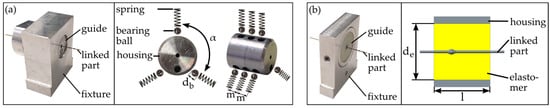Based on this scheme, two prototypes were built. Concept 1 (see Figure 4a) uses bearing balls and spiral springs. The kinematics is realized by the radius of the bearing ball and the contour of the parts. The advantage of this solution is that the components are available as standard parts with high quality. Based on the characteristics of the used components and the considered linked parts, the nominal preload of the guide is Fframe = 0.34 N for a frame diameter of dframe = 360 µm. The force of one spring on a part of diameter dpart = 660 µm is Fpart = 0.66 N.