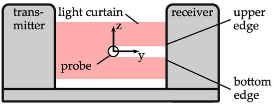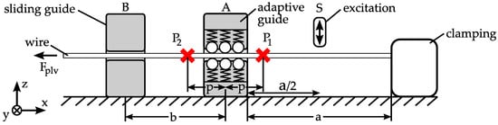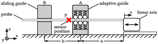 For each of the tests, one of the two adaptive guides, G1 and G2, as well as an additional sliding guide are used. Their positions are named A and B. The distances between A and the home position x = 0 mm of the linear axis as well as the distance between A and B are described by the variables a and b, respectively. The different adaptive guides are mounted in position A. Furthermore, an aluminium block with a bore of a diameter of dsb = 400 µm is used for sliding the bushing at position B. The sensor is located at position P, directly outside the adaptive guide. The position of the probe in the z-direction is measured by an optical micrometer (Figure 6). The accuracy of the used device is specified to 0.7 µm. Between the single measurements, the probe is moved in the x-direction by the linear axis. The displacement between two measurements determines the measurement point distance Δx relative to the wire. The sensor detects the upper edge of the probe. Consequently, the measurements consider only the z-direction. Assuming that the used probe is not rotationally symmetric, a different behavior in the y- and z-directions is expected and the angular orientation of the probe around its length axis (x-axis) could influence the measurement results. Consequently, two measurements are performed for each test configuration. First, a measurement with the same probe section and probe orientation is performed for both guides. Following this, the probe is rotated 90° around its length axis (x-axis) and the measurements are repeated. For each measurement, the probe is fed in fixed steps of distance Δx until reaching position x = 10 mm and measured for each step, before being pushed back to the starting position. This measurement procedure is repeated 10 times. The radial deviation e is calculated by relating each measurement to the initial value at the position of x = 0 mm. The centering force of the guides is assumed to be direction-independent. Hence, the orientation of the guides is considered negligible. Nevertheless, G1 is oriented during testing in a way so that the uppermost of the three springs is aligned with the z-axis.