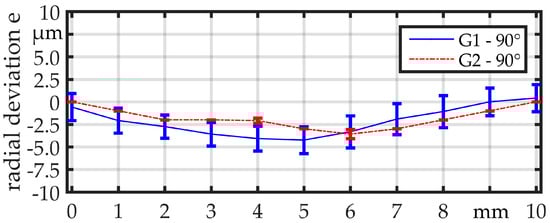 Comparison of radial deviation for G1 and G2 measured with wire, dwire = 360 µm.