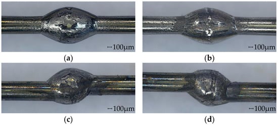 Finally, G1 and G2 are tested with real linked parts. For further identification of the influence of the contour of the parts, two different linked parts are used (Figure 9). Linked part 1 shows a good rotational symmetry and no measurable offset op1 ≈ 0 µm between the two wires at both sides of the part. Linked part 2, in contrast, shows an offset op2. The frame diameter of dframe = 360 µm and the part diameter of dpart = 660 µm is equal in both cases. The length of the parts is lpart 1 ≈ 1200 µm and lpart 2 ≈ 1000 µm. The measurement procedure is the same as before, but the measuring point distance is reduced to Δx = 0.2 mm. Furthermore, the measurement is again performed two times for each linked part and, for the second measurement, the linked part is rotated 90° around its length axis (x-axis). The parts are illustrated in Figure 9 in both orientations. The measured offset of linked part 2 is op2,0° = 165 µm for the orientation of 0° and op2,90° = 225 µm for the orientation of 90°.