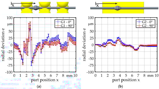 In the measurements with G1 (Figure 10a), the regions where the bearing balls are in contact with the parts can clearly be recognized by the unsteady curve. The range of the deviation is about 40 µm in the zones where only the wire is in contact with the bearing balls. The overall range of the deviation is about 160 µm. A similar behavior can be observed in the measurements for G2 (Figure 10b), but the curve is smoother. The overall range of the deviation is about 50 µm. Before the part enters the guide (x = 1 mm) and after it has passed through (x = 9 mm), the deviation e is close to 0 µm. The curves for the two different angular orientations are quite similar. As expected, the deviation for linked part 2 is much higher and in a range of 225 µm (Figure 11). The deviation is on a constant level, when the part is not within the guide, but there is a significant offset between the two described regions when the part is before and when it is behind the guide. For both guides, the curves are similar, but for G2, the curve is smoother and shows a smaller standard deviation.