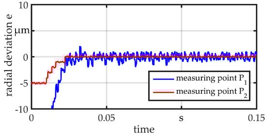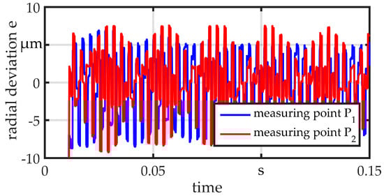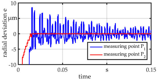 All measurements are performed with a raw wire with a diameter of dwire = 360 µm. The wire is clamped at one end, fitted within a sliding guide (position B) and preloaded with Fplv = 25 N at the other end. The different guides are mounted in position A during testing. At point S, the wire is excited by displacing and releasing it in a repeatable way, so that it vibrates in its eigenfrequencies. The wire is simultaneously measured at the points P1 and P2. The same sensor in previous measurements is used and the initial value is set to zero in order to calculate the radial deviation e. For comparison, a standard non-adaptive sliding bushing with a diameter of dsg = 800 µm is used. Results are shown in Figure 13. The bushing provides a clearance of 0.22 mm between the wire and guide, as may be necessary in the worst case for a linked part. The wire can almost vibrate freely on both sides of the guide. The amplitude is about 8 µm. The results for the guides G1 and G2 are illustrated in Figure 14 and Figure 15, respectively. Both show a good suppression of radial vibration for the wire segment behind the guide. Considering the vibrations at point P1, G2 shows a better damping, as could be expected for an elastomer. In the measurements, no vibration can be seen. There is only a variation in the range of the sensor resolution.