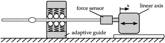 The developed passive principle is based on the idea of using the feed force for a diameter adaption of the guide. When this adaption is realized by spring elements with a constant spring rate, the feed force changes during feeding. Measurements are performed with a force sensor (Figure 16). The feed distance is 20 mm, so that the part is able to completely pass through the guide.