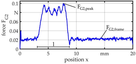 Figure 17 and Figure 18 illustrate two exemplary results at a feed velocity of v = 10 mm/s. In both measurements, the wire is tensioned at the start of the motion and the force rises quickly. Only the frame moves through the guide and the force is relatively constant with FG1,frame = 0.02 N and FG2,frame = 0.03 N. In the measurements of G1, the force peaks of FG1,peak = 0.06 N appear when the part comes in contact with the bearing balls. The distance m ≈ 3 mm between the balls can be recognized in the measurement. For G2, the force rises up to FG2,peak = 0.1 N when the part passes through the guide. In this case, there is a little difference between the zone of elevated force and the length of the guide, which is l = 8 mm. This can be explained by the lower axial stiffness of the elastomer element.