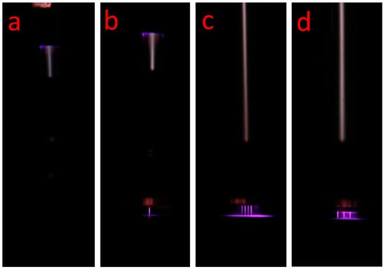 Helium/oxygen plasma was easily generated in the glass tube when the voltage raised to 3.5 kVpp. After raising applied voltage up to about 4.5 kVpp, plasma microjet expanded out of the glass tube was still too short to be visible to the naked eyes, as shown in Figure 3a. A brighter and longer plasma microjet was observed when placed the Z sliding platform connected to electrical ground and the substrate under the nozzle, as shown in Figure 3b. This was due to the substrate acting as a floating electrode, the plasma microjet was greatly enhanced when contact with the platform. The plasma in the glass tube increased the density of the seed electrons to lower the ignition voltage of plasma microjet, which resulted in a non-thermal and stable plasma microjet []. The plasma microjet array was formed successfully in Figure 3c. In addition, silicon micro-nozzles get charged from the bombardment of plasma in the glass tube, the unexpected plasma was generated by the strong electric field which exceeds the threshold for ignition in the whole space under the nozzle, as shown in Figure 3d.
