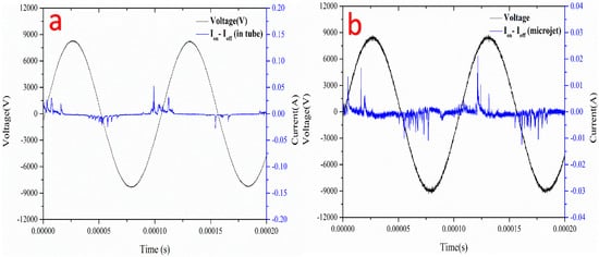 As shown in Figure 4a,b, the discharge current waveform was measured by subtracting the displacement current from the total current, corresponding the situation in Figure 3a,b. Plasma microjet could hardly be seen in Figure 3a, thus, discharge waveforms in Figure 4a mainly represent the DBD discharge current in the glass tube. The peak value of discharge current was around 50 mA, which suggested that the plasma was active. According to the literature [], two discharge current pulses were commonly observed in one DBD discharge cycle. It is speculated that other herringbone-like current peaks in Figure 4a may represent the discharge between charged silicon nozzle and the high-voltage electrode.